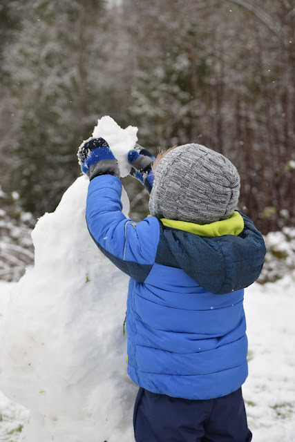 The slowly falling flakes made for a huge smile on our toddler, Waylon's, face. His smile grew when he was shown how fast a snowball can grow into a snowman. Waylon was in charge of the snowman's head, and , I'm sorry to say that it never grew bigger than a small toddler snowball (insert laugh here).